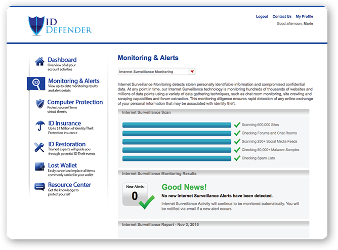 INTERNET SURVEILLANCE MONITORING & ALERTSInternet Surveillance Monitoring proactively detects stolen personally identifiable information and compromised confidential data, and alerts are sent if a member’s personally identifiable information is found being bought or sold online. |